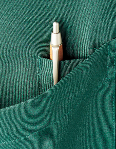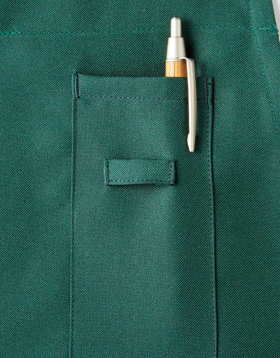 特長:静電気防止、退色防止、両脇アウトポケット、右側のみアウトポケットの内側にペン挿しポケット付き、左胸ペン挿しポケット、ネーム挿しループ付き |