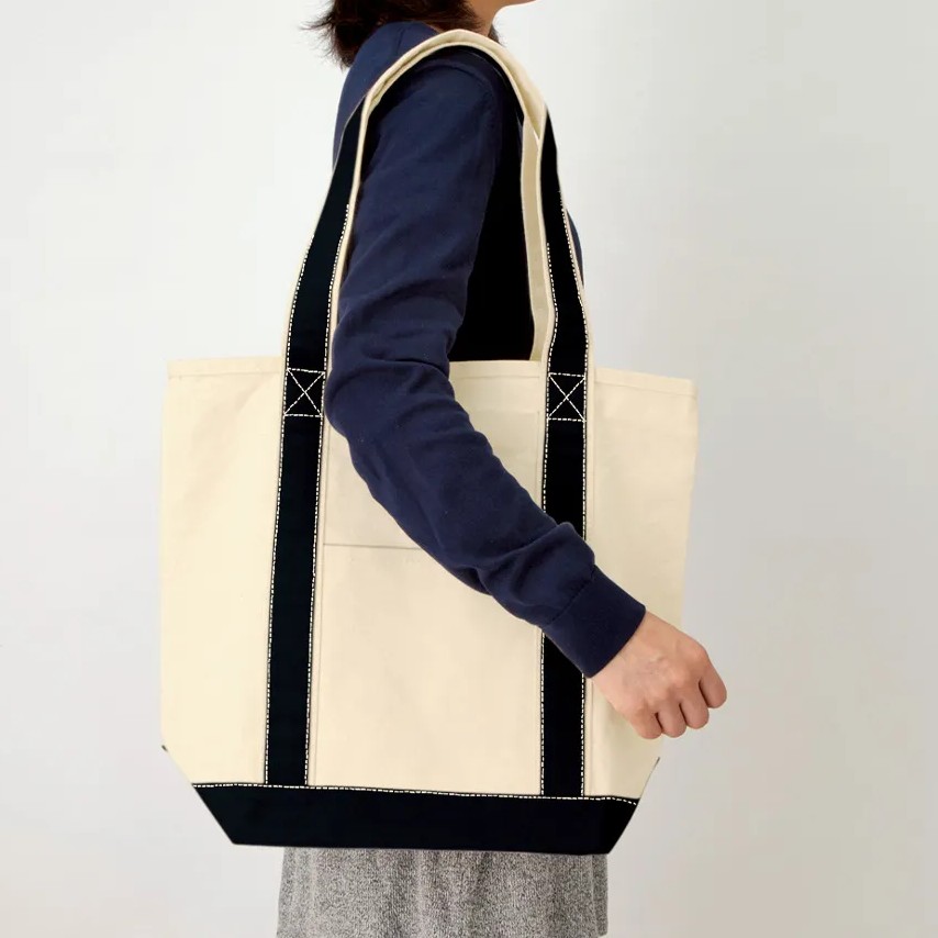 特長:バイカラー配色が冴えるトートバッグです。広めの底マチが使いやすく、生地も厚手なのでバッグ単体で自立もします。同仕様でSサイズ、Lサイズもございます。 |